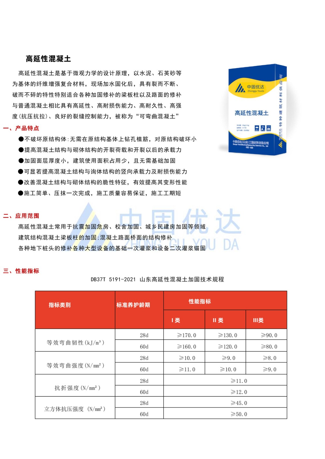 泰安高延性混凝土 泰安高延性混凝土是具有高抗裂性、高延展性、高韧性、高耐损伤的一种高富纤维混凝土,采用特种水泥和骨料,辅助高韧性高弹性纤维和外加剂混合而成,现场加水固化后,具有裂而不断、破而不碎的特性,用于各加固修补的梁板柱以及路面的修补。