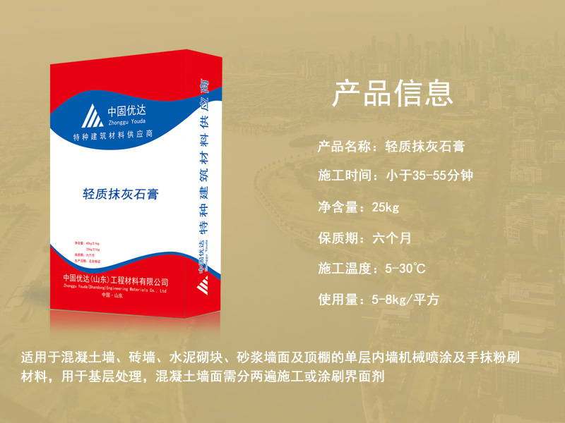 轻质石膏抹灰砂浆也叫做轻质抹灰石膏、轻质粉刷石膏,是以高纯度的半水脱硫石膏为主要胶凝材料,加入无机轻集料和适量的保水剂、缓凝剂等外加剂,经工厂预混制成的成品抹灰石膏。可广泛取代传统的水泥砂浆找平,用于室内建筑内墙和楼板的抹灰找平是建筑内墙以及顶板常用的一种抹灰材料,可以代替水泥以及石灰砂等,在适用性非常广泛,适用于任何墙体,克服传统抹灰的缺点,而且这种抹灰粘接力非常的强,能够与任何基材进行粘接,不会受到厚度的限制。在流动性以及饱水性上也是非常的,可以在0度进行施工,这种石灰膏环保无味、抗裂性效果好,具有保温隔热的效果,能够调节室内的湿度、干度方便施工,节省工期和界面处理的工序以及材料使用,泰安工程专用粉刷石膏。